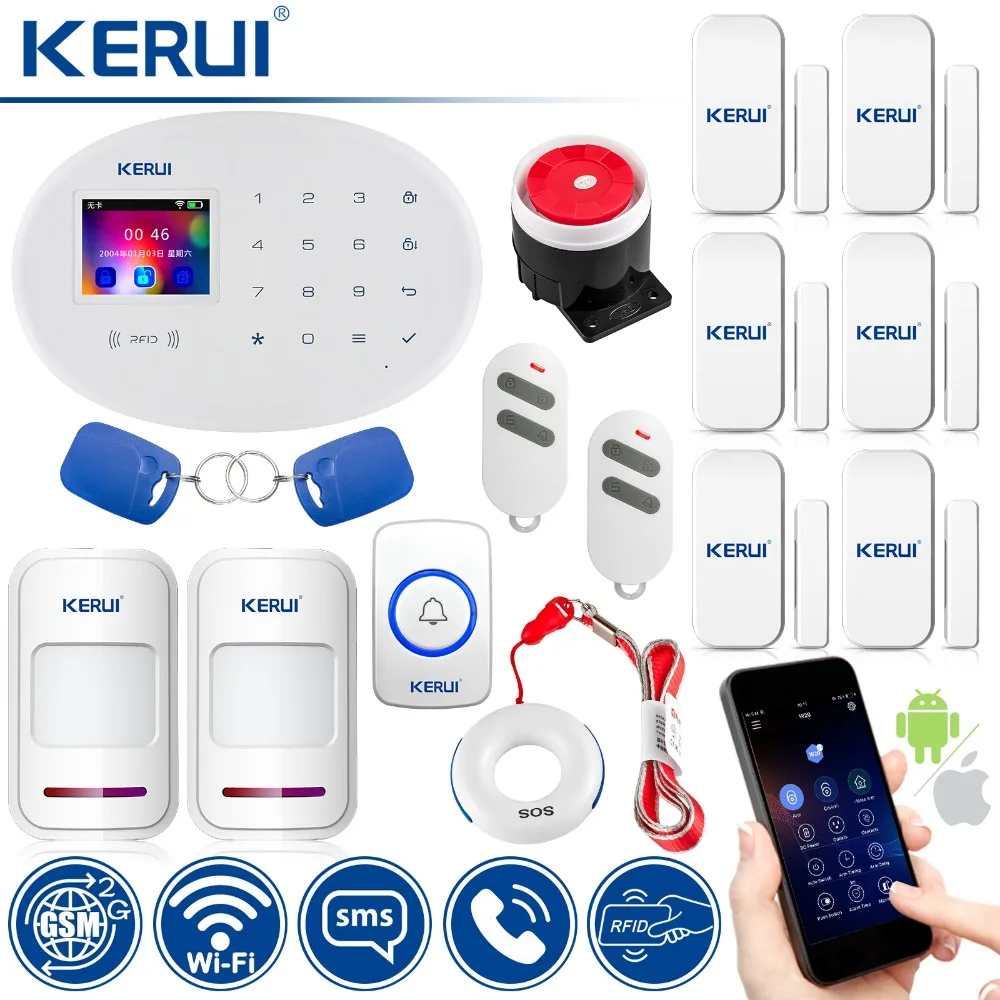 Speciale prijs - KERUI Wireless Home Alarm Security Protection WIFI+GSM Security Alarm System With Door bell Emergency Button Sensor Detector
