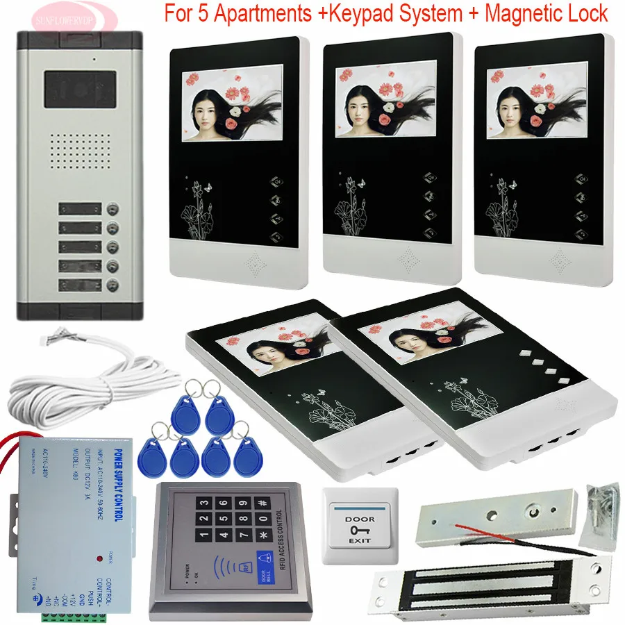 Beste prijs - 4.3'' Video Intercom Door Phone 5 Monitors Doorbell Camera for 5 Family Apartment + RFID Access System With Electromagnetic Lock