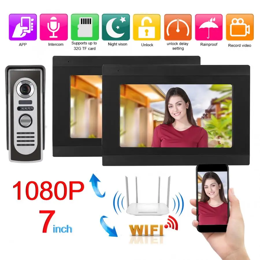 Beste prijs - 7inches 1V2 IR WIFI Video Doorbell Visible Intercom APP Camera 1080P 100-240V door bell waterproof no battery US/EU/UK/AU Plug