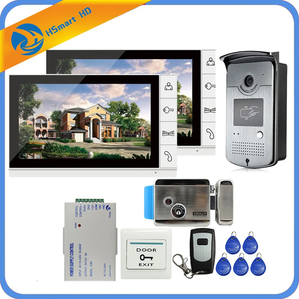 Speciale prijs 9 inch Wired Video Door Phone Intercom Entry System 2 Monitor + 1 RFID Access IR 700TVL Camera + Electric Control Door Lock Is beter dan