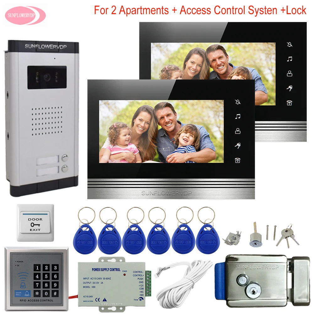 For 2 Apartments Touch Keys 7\ Indoor Monitors Outdoor Waterproof Doorbell Access Control Video Intercom + Electronic Door Lock