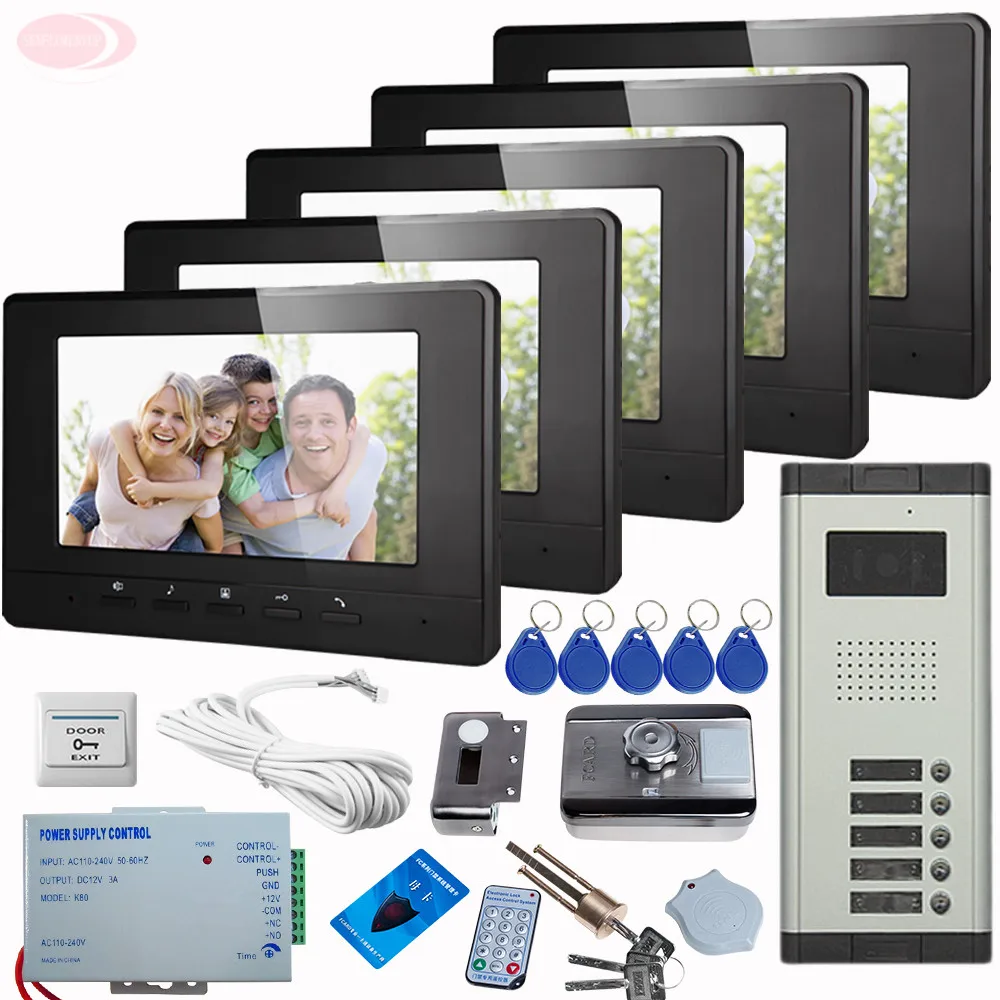 Beste prijs SUNFLOWERVDP Doorphone For Video Intercom Interphone 5 units With Rfid Unlock Electronic Lock CCD Camera Doorbell intercom Kit Beste prijs
