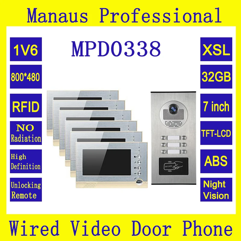 Speciale prijs - Six 7 inch Memory Monitors Multi Apartments Building Intercom System Video Door Phone Support 32G TF Card and RFID Unlock D0338