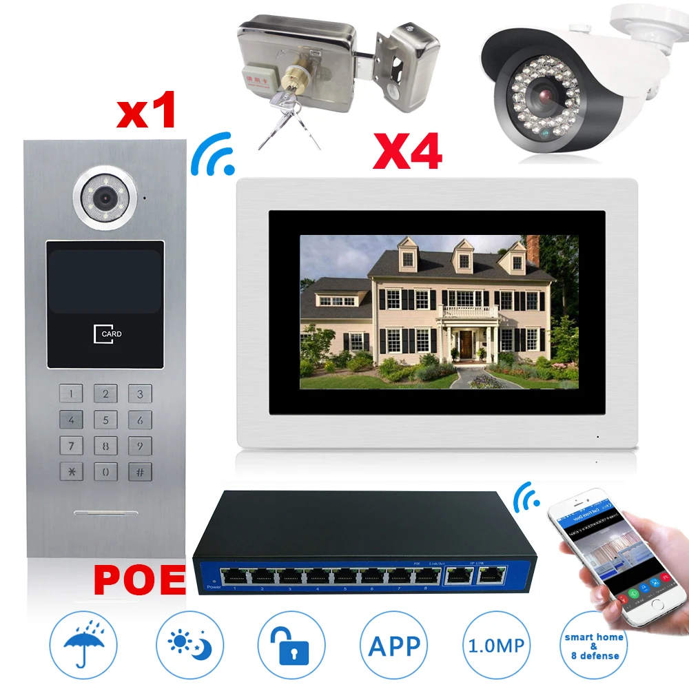 Speciale prijs - WiFi IP Video Door Phone Video Intercom Mobile App 4 Apartments Home Access Control System+IP Camera+Electronic Locks+POE Switch