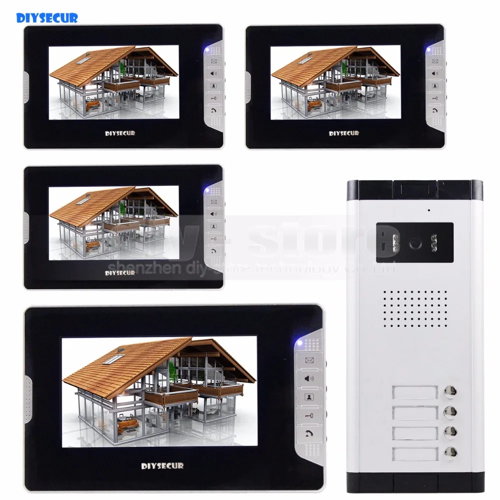 Speciale aanbiedingen - DIYSECUR Quality 7\ 4-Wired Apartment Video Door Phone Audio Visual Intercom Entry System IR Camera for 4 Families