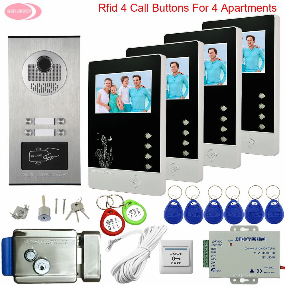 Speciale prijs Video Door Entry Systems With Camera Rifd Access Control Video Intercom 4 Apartments 4.3\ Monitor for Doorbells + Electric Lock Goedkoop online