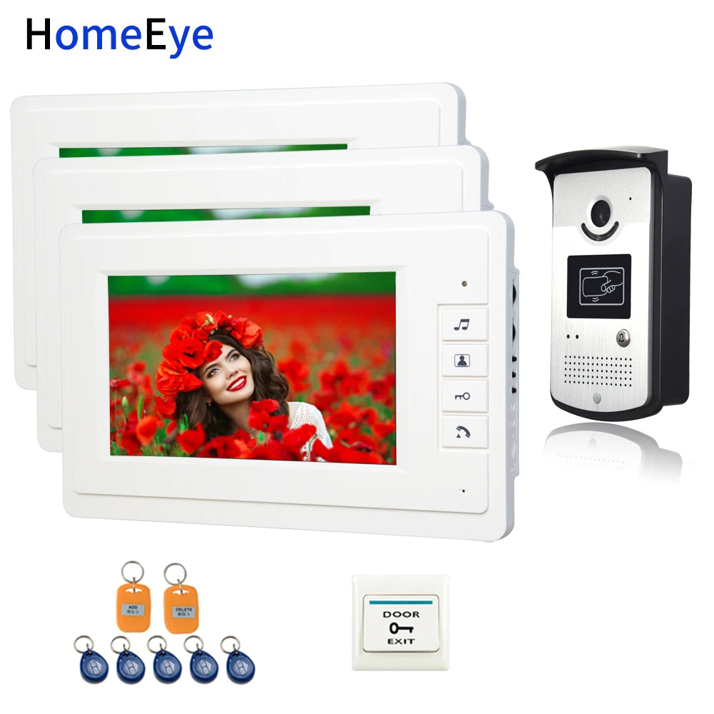 7inch 1200TVL Video Door Phone Video Intercom Door Bell 1 to 3 5-Wire Indoor Monitor+Rainproof Call Button+RFID Card+Exit Switch