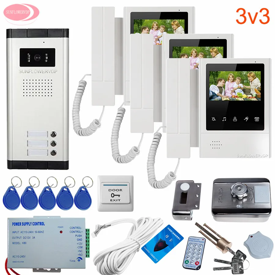 Prijs vergelijkingen van - 3 Apartments Video Call for The Entrance Door +3 Monitors Wired Video Door Entry Keys for The Doorphone With Rfid Door Lock Kit Beste aanbiedingen