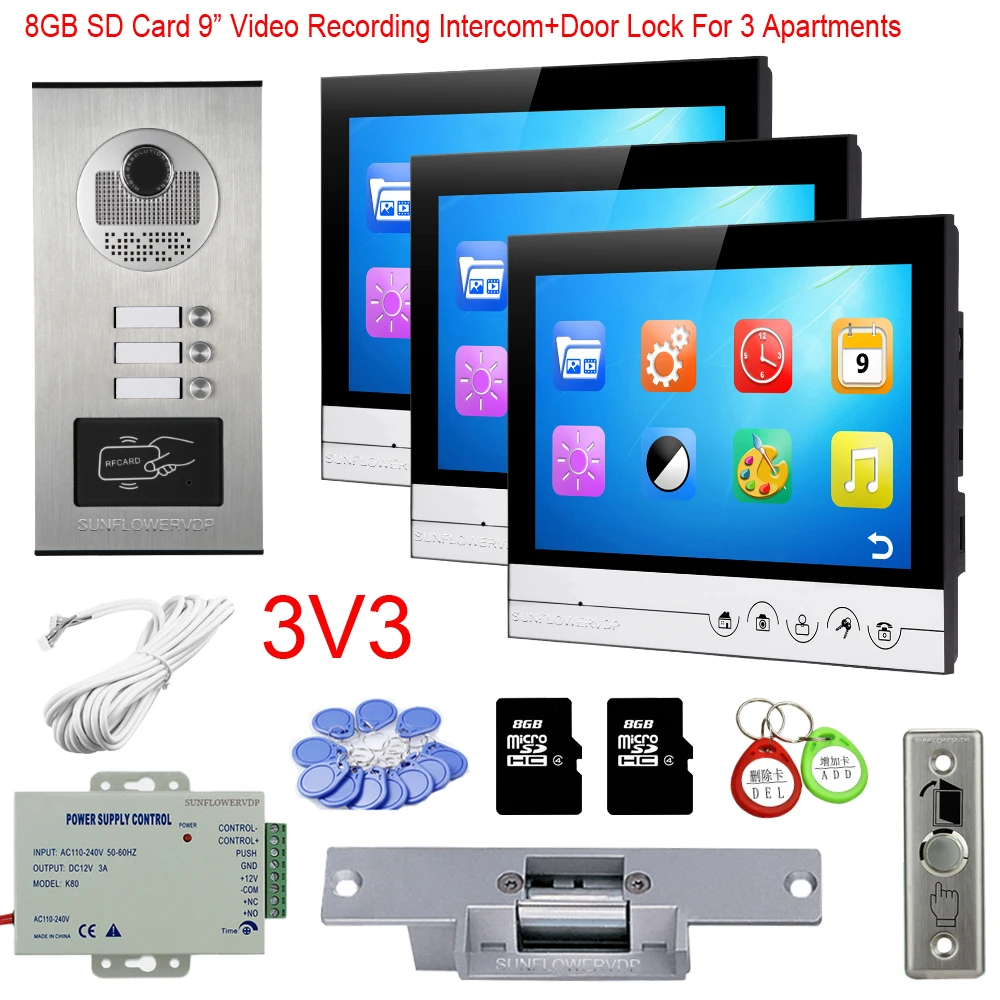 Beste prijs Rfid Camera 2/3/4/6 Call Buttons Intercom Video Intercoms 8GB Video Recording 9\ Color Monitor Home Intercom With Electric Lock Beste prijs