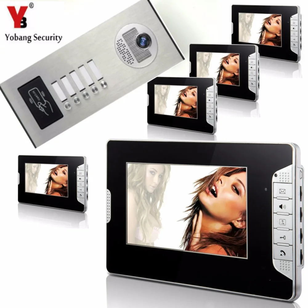^ Goedkoop Yobang Security 5 Units Apartment Intercom System Video Intercom Video Door Phone Kit HD Camera 7 Inch Monitor with RFID keyfobs Hoe krijg ik