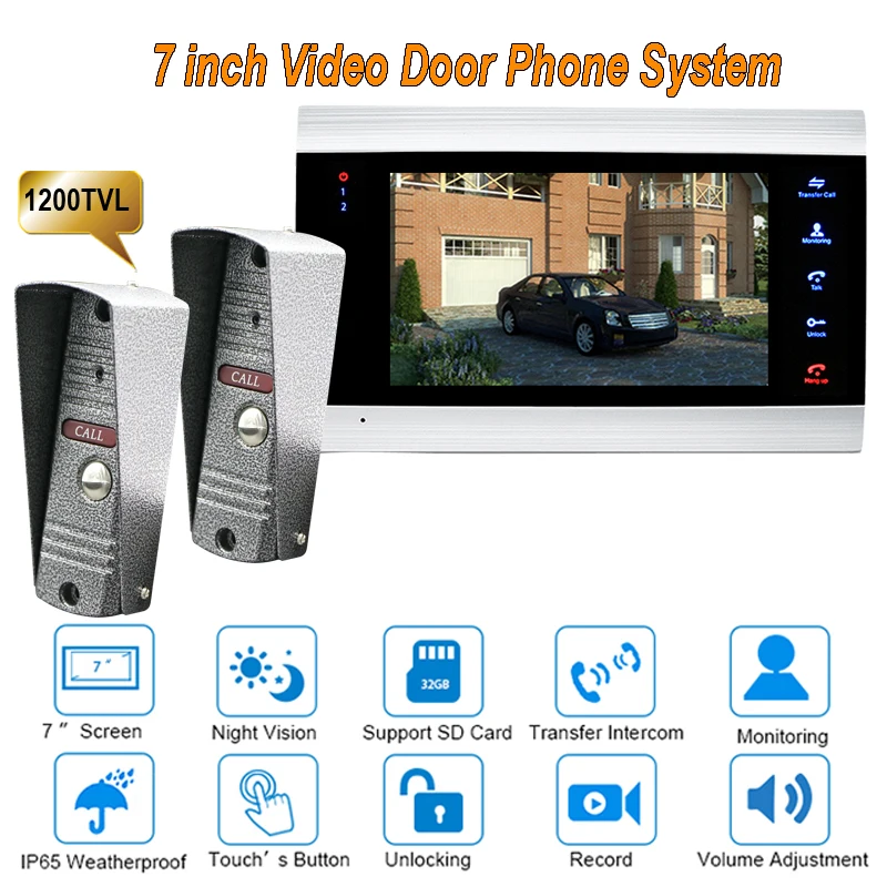 New 7 inch 1200TVL Video Door Phone Doorbell Intercom system With IP65 Camera DoorPhone 2V1