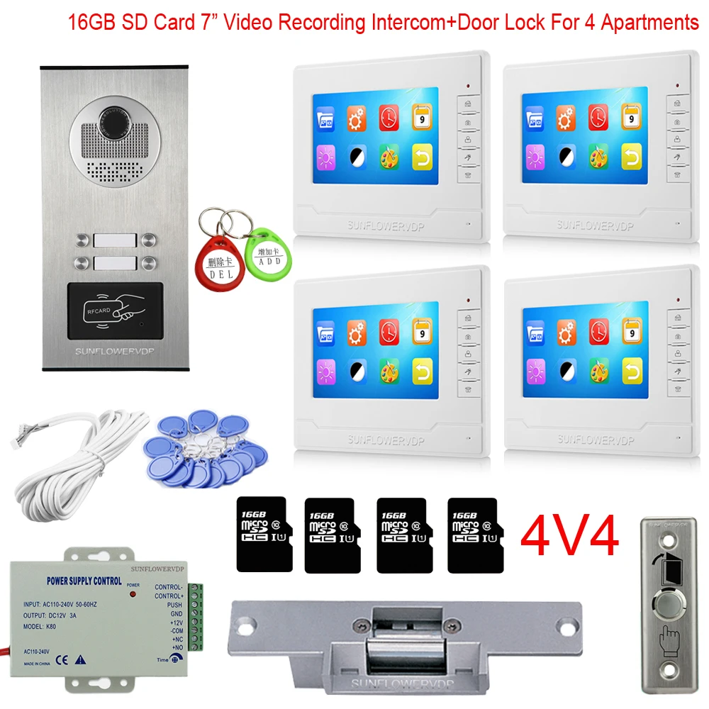 ^ Goedkoop - Rfid 2/3/4/6 Multi Call Buttons Intercom System 16GB Video Recording 7”Color Monitor House Intercom With Electric Door Lock Kit