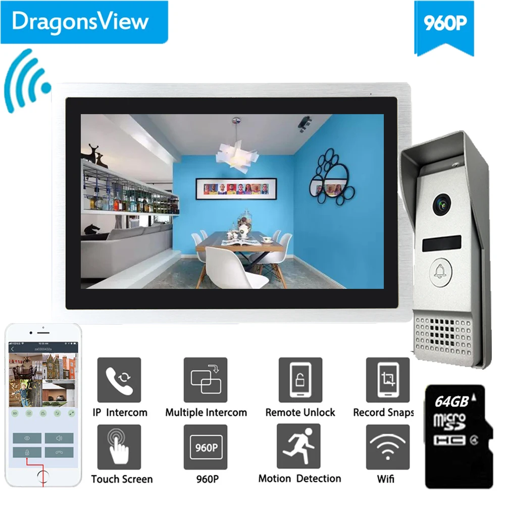 Goedkoopste - Dragonsview Wifi Video Doorbell with Monitor IP Video Door Phone Intercom System Wide Angle Touch Screen Record Motion Detection ^ Goedkoop