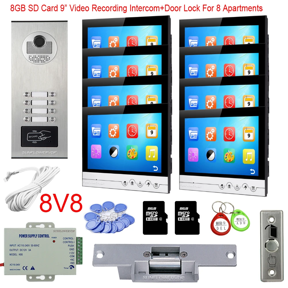 ^ Goedkoop - Rfid Camera 8/10/12 Call Buttons Interphone With Camera 8GB Video Recording 9\ Color Monitor Video Intercom With Electric Lock